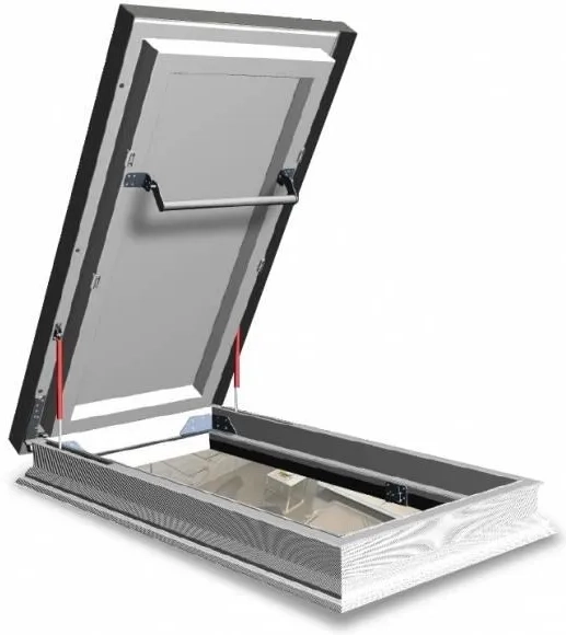 Wyłaz do dachów płaskich DRL to produkt w pełni zmontowany, gotowy do instalacji. Ościeżnica wykonana jest z wielokomorowych profili PVC wypełnionych materiałem termoizolacyjnym, co zapewnia wysoką izolacyjność. Skrzydło posiada wypełnienie z płyty warstwowej, gwarantujące bardzo dobre parametry termoizolacyjne. Otwiera się do kąta 60°, a dzięki zastosowaniu sprężyn gazowych proces otwierania i zamykania jest wyjątkowo łatwy, z możliwością pozostawienia skrzydła w pozycji otwartej. Dodatkowym elementem zwiększającym bezpieczeństwo użytkowania jest taśma antypoślizgowa umieszczona na podstawie, która zapewnia pewny dostęp do płaskiego dachu. Rozmiary wyłazu zostały dopasowane do połączenia ze schodami strychowymi FAKRO LML, sprzedawanymi osobno i dostępnymi w naszym sklepie. Istnieje również możliwość osadzenia wyłazu na dodatkowej podstawie XRD/W, która pozwala na jego podniesienie i dostosowanie do indywidualnych potrzeb. Montowany na powierzchni dachu- cała konstrukcja izolowana termicznie.