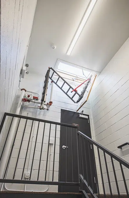 Zdjęcie przedstawia możliwą opcję zastosowania. Do wyłazu dachowego FAKRO DRL możesz domówić dodatkowo schody strychowe FAKRO LML aby uzyskać maksymalną kompatybilność i estetykę wykończenia.