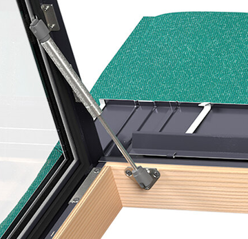Wyłaz dachowy FAKRO WGU-X otwierany na bok z kołnierzem uniwersalnym oraz kołnierzem paroprzepuszczalnym, wyposażony w sprężynę gazową i listwę progową.